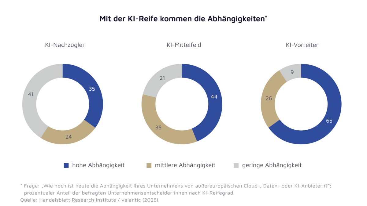 Unternehmen mit einem hohen KI-Reifegrad* blicken der Studie zufolge besonders kritisch auf ihre Abhängigkeit von außereuropäischen Cloud-, Daten- und KI-Anbietern – und ziehen daraus auch deutlichere Konsequenzen als der Rest. Während bei Unternehmen mit niedrigem KI-Reifegrad nur rund ein Drittel die eigene Abhängigkeit als hoch einschätzt (35 Prozent), sind es bei den KI-Vorreitern fast zwei Drittel (65 Prozent).