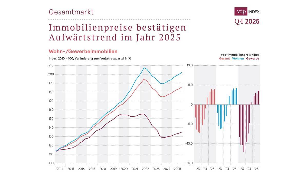 „Nach der abrupten Zinswende hat der Immobilienmarkt in Deutschland seine Erholungsphase im Jahr 2025 fortgesetzt. Die Preise steigen stetig, jedoch deutlich weniger dynamisch als in der Niedrigzinsphase“, erläuterte vdp-Hauptgeschäftsführer Jens Tolckmitt. Aufgrund des anhaltenden Wohnraummangels sei davon auszugehen, dass Wohnimmobilien auch im laufenden Jahr Preiszuwächse verbuchen würden. Die Entwicklung der Gewerbeimmobilienpreise sei dagegen schwieriger vorherzusagen. „Wirtschaftliche Entwicklung und Geopolitik bleiben relevante Unsicherheitsfaktoren“, so Tolckmitt.