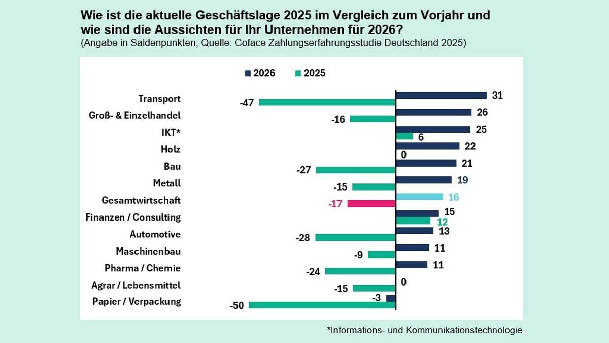 Im Jahr 2025 berichten 33 Prozent der befragten Unternehmen in Deutschland von einer Verschlechterung ihrer Geschäftslage gegenüber 2024, während 16 Prozent eine Verbesserung feststellen. Daraus ergibt sich eine Bilanz von -17 Saldenpunkten – eine deutlich weniger pessimistische Einschätzung im Vergleich zu -39 Punkten aus der Vorjahresbefragung. Besonders kritisch bewerten Unternehmen aus der Papier- und Verpackungsindustrie (-50 Sp.) sowie der Transportbranche (-47 Sp.) ihre aktuelle Lage. „Die Papierbranche ist äußerst energieintensiv. Obwohl die Strom- und Energiepreise gesunken sind, bleiben die Kosten bei einer verhaltenen Nachfrage zu hoch. Die Transportbranche leidet weiterhin unter der Rezession in der Industrieproduktion und der anhaltenden Konsumzurückhaltung, mit spürbaren Folgen für Speditionen“, sagt Coface-Volkswirtin Christiane von Berg.